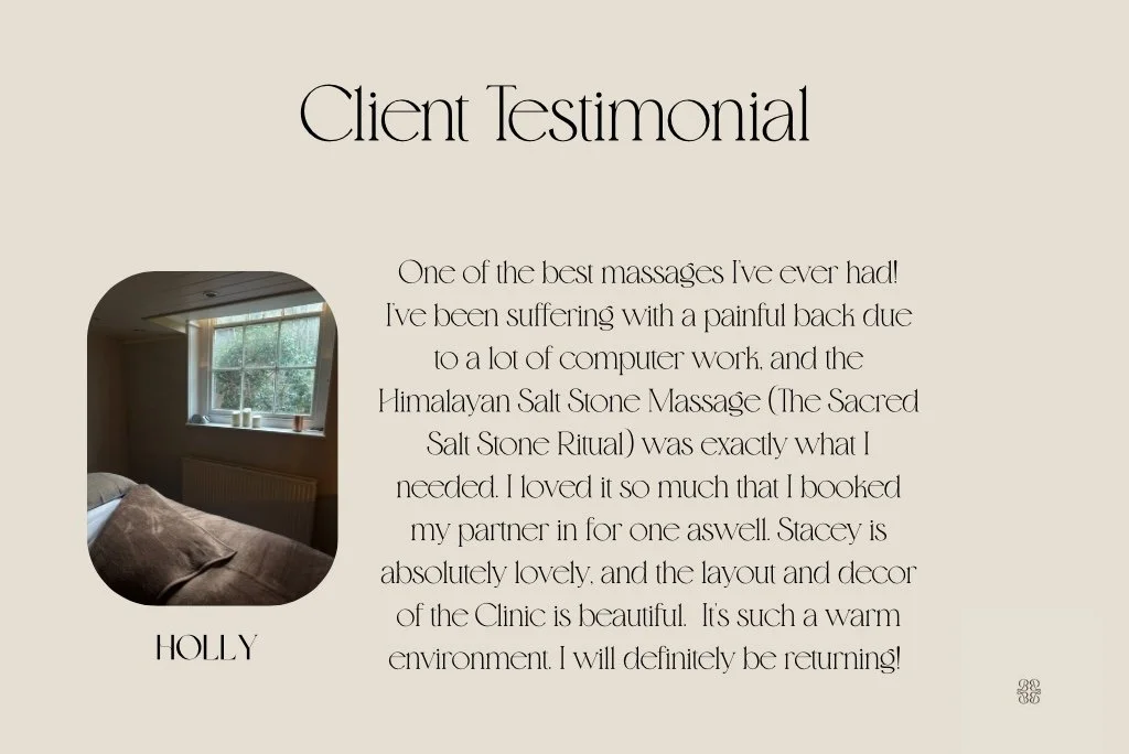 Client testimonial page with a photo of hands receiving a massage, and a detailed testimonial from Maria Poll about her experience at Stacey's Wellness Clinic.
